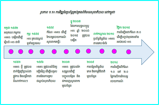 ក្រសួងសុខាភិបាលបានបង្កើតអនុគណៈកម្មការប្រព័ន្ធគ្រប់គ្រងព័ត៌មានសុខាភិបាល ជាមួយនឹងការងារបង្កើតប្រព័ន្ធព័ត៌មានសុខាភិបាលទូទាំងប្រទេសមួយ នៅខែកក្កដា ឆ្នាំ ១៩៩២។ ប្រព័ន្ធគ្រប់គ្រងព័ត៌មានសុខាភិបាលត្រូវបានប្រកាសដាក់ឱ្យប្រើប្រាស់ជាផ្លូវការនៅឆ្នាំ ១៩៩៣ និងត្រូវបានគ្របដណ្ដប់ទូទាំងប្រទេសនៅខែ កុម្ភៈ ឆ្នាំ ១៩៩៥។ បន្ទាប់ពីការចាប់ផ្ដើមនេះ ប្រព័ន្ធគ្រប់គ្រងព័ត៌មានសុខាភិបាលបានដំណើរការ ជាមួយនឹងការពិនិត្យឡើងវិញជាច្រើនដំណាក់កាល (សូមមើលរូបភាព ១.១ សម្រាប់ដំណើរវិវឌ្ឍន៍ នៃប្រព័ន្ធគ្រប់គ្រងព័ត៌មានសុខាភិបាល នៅកម្ពុជា)។ នៅឆ្នាំ ១៩៩៦ កំណែត្រូវបានធ្វើឡើងដើម្បីសម្របទៅនឹងការផ្លាស់ប្តូរ បានមកពីការចាប់ផ្ដើមនៃផែនការគ្របដណ្ដប់វិស័យសុខាភិបាល ដែលកំណត់ថា សេវាដែលនឹងត្រូវបានផ្ដល់ដោយមូលដ្ឋានសុខាភិបាលនីមួយៗ។ នៅឆ្នាំ ១៩៩៩ មានការកែសម្រួលមួយ ដើម្បីលើកកម្ពស់របាយការណ៍សូចនាករគន្លឹះមួយចំនួន។ នៅឆ្នាំ ២០០៣ តម្រូវការសូចនាករមួយចំនួនត្រូវបានបន្ថែម និងការដកចេញនូវសូចនាករដែលមិនប្រើមួយចំនួនផងដែរ។ នៅឆ្នាំ ២០០៩ សូចនាករបែងចែកតាមភេទ និងសូចនាករនៃកម្មវិធីជាតិមួយចំនួនទៀតត្រូវបានបញ្ចូលបន្ថែម។ នៅពាក់កណ្ដាលឆ្នាំ ២០១០ មានការផ្ទេរទិន្នន័យពីប្រព័ន្ធទិន្នន័យប្រើប្រាស់ MS Access ទៅកាន់ប្រព័ន្ធទិន្នន័យ តាមគេហទំព័រ (PHP/MySQL) ដើម្បីកាត់បន្ថយការងាររដ្ឋបាល និងរយៈពេលរៀបចំរបាយការណ៍ ហើយក្នុងពេលជាមួយគ្នានោះក៏ប្រមូលបានទិន្នន័យទាន់ពេល និងត្រឹមត្រូវ ពីគ្រប់មូលដ្ឋានសុខាភិបាលផងដែរ។ ប្រព័ន្ធទិន្នន័យតាមគេហទំព័រថ្មីនេះ បានធ្វើការកែលម្អជាច្រើនកន្លែង និងត្រូវបានរៀបចំទៅតាមព័ត៌មានត្រឡប់ដែលផ្ដល់ដោយអ្នកប្រើប្រាស់ប្រព័ន្ធ និងត្រូវបានដំឡើងកម្រិតទៅជាកំណែ ៣.០ បច្ចុប្បន្នតាំងពីឆ្នាំ ២០១៥ មក។